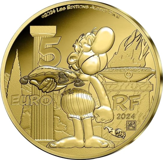 Die Vorderseite der Münze ziert der liebenswerte Idefix, der kleinste Held aus den berühmten Asterix-Comics. Mit einem Lorbeerkranz geschmückt, symbolisiert Idefix Erfolg und Stolz – eine perfekte Hommage an die Olympischen Spiele. Auf der Rückseite wird das Cover des Comicstrips „Asterix bei den Olympischen Spielen“ adaptiert. Hier trägt Asterix stolz den Nennwert der Münze, was die Verbindung zu den legendären Comics noch stärker betont.