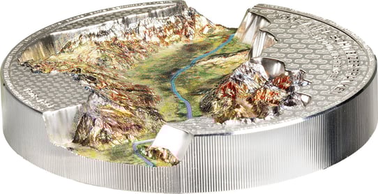 Die Münze besticht durch ihre High Relief Prägung, die eine faszinierende dreidimensionale Darstellung des Rheintals ermöglicht. Auf der Rückseite der Münze ist das Rheintal in unglaublichen Details und realistischer Farbgebung abgebildet. Alle umliegenden Gemeinden sind am Rand der Münze eingraviert, was dieses Stück zu einem numismatischen Naturwunder macht. Die Vorderseite zeigt das Wappen von Liechtenstein sowie die Inschriften „FÜRSTENTUM LIECHTENSTEIN“ und „HUNDERT FRANKEN“.