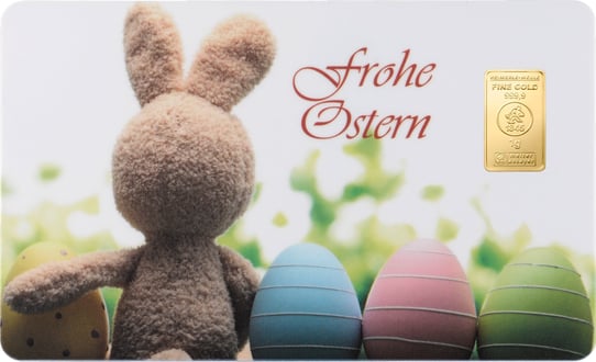 Ein strahlendes Geschenk zu Ostern: Der 1g Goldbarren Heimerle und Meule Frohe Ostern FineCard