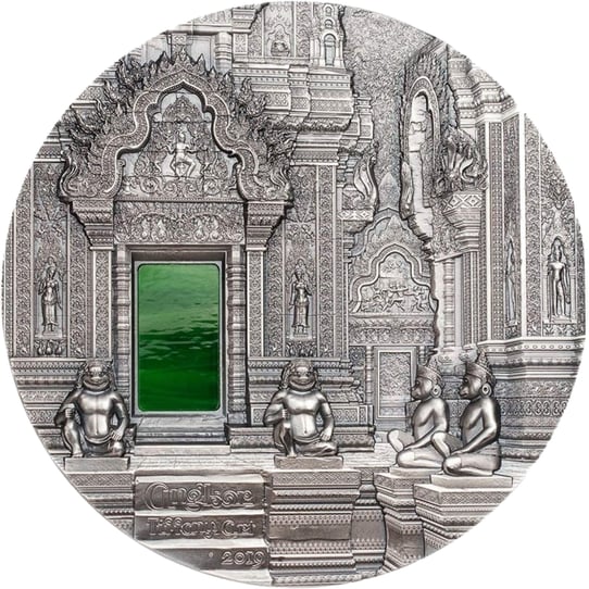 Angkor Wat ist eine buddhistische Tempelanlage in Kambodscha. Erbaut wurde Angkor Wat von dem historischen Volk der Khmer im Jahre 1113 nach Christus. Auf der Münze zusehen ist, dass beeindruckende Eingangsportal des Tempels Angkor. Dieses ist mit zahlreichen buddhistischen Symbolen geschmückt. Neben dem Eingangsportal befinden sich Affenfiguren, welche diesen bewachen. Auf der Rückseite wird ebenfalls ein Teil des Tempels dargestellt. Besonders auffallend sind hier die Löwenfiguren.