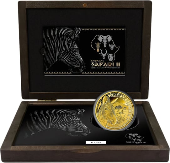 Das zweite Motiv dieser neuen Serie ist dem Zebra gewidmet. Es ist ein detailliert dargestellter Zebrakopf zu sehen, im Hintergrund die afrikanische Savanne mit Bäumen und Graslandschaften. Ebenso können Sie einen Leoparden erkennen, der seine Beute ins Visier zu nehmen scheint. Die Stückelung, das Prägejahr und die Feinheit sind neben dem Schriftzug ”African Safari” und der Seriennummer auf der Motivseite geprägt.