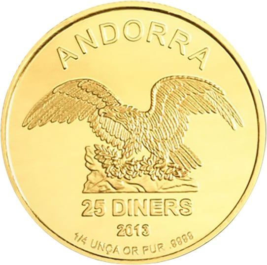 Auf der Vorderseite der Münze ist wieder einmal der Adler auf einem Felsen abgebildet. Dieser hat seine mächtigen Flügel ausgebreitet und thront über dem Fürstentum. Durch die goldene Ausführung bekommt das Motiv einen besonderen Schliff. Umrandet wird das Bild von dem Schriftzug -ANDORRA- sowie dem Herstellungsjahr und der Währung. Die Rückseite der Münze zeigt das bekannte, in vier Teile aufgeteilte, Wappen Andorras. Als Besonderheit des Staatswappens gilt die sogenannte „Mitra“, welche die Kopfbedeckung eines Bischofs, durchkreuzt von seinem Stab, darstellt. Das Avers ist normalerweise ohne weitere Schriftzüge versehen.