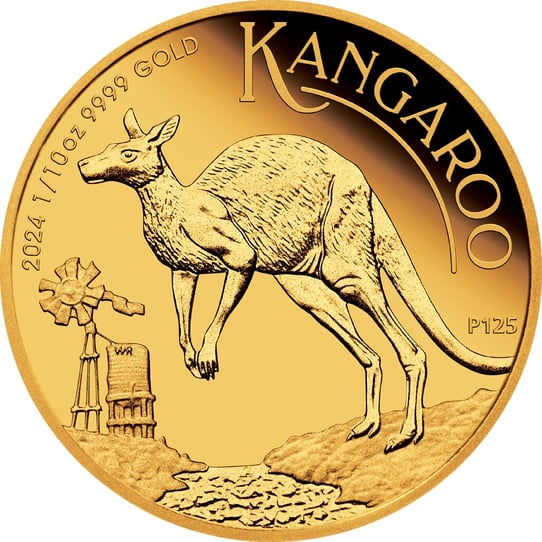 Das Motiv der Münze zeigt ein kraftvolles, in voller Größe abgebildetes Känguru, das elegant über ein ausgetrocknetes Flussbett springt, mit einem Windrad und einem Wassertank im Hintergrund – eine Szene, die das ländliche Australien repräsentiert. Der Schriftzug "KANGAROO" sowie das prägende Mintmark „P125“, welches auf das 125. Jubiläum der Perth Mint verweist, verleihen dem Design eine besondere Note. Am unteren Rand der Münze sind die Angaben zum Ausgabejahr, Gewicht und Feingehalt zu finden, welche das kunstvolle Design komplettieren.