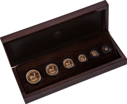 • Sechs edle Goldmünzen in höchster Prägequalität Polierte Platte mit außergewöhnlichem Glanz