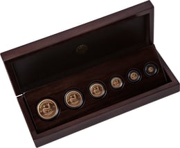 Die sechs Goldschätze ruhen sicher in einem hochwertigen Holzetui aus dunkelbraunem Edelholz. Die schwarze Samtauskleidung bildet einen perfekten Kontrast zum warmen Goldton der Münzen. Jede Münze ist in einer schützenden Kapsel eingefasst – von der größten zur kleinsten Einheit elegant arrangiert. Das eingeprägte Emblem im Deckel unterstreicht die Exklusivität dieses Sets.