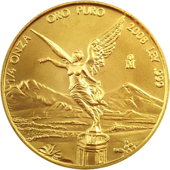 Auf der Vorderseite der Libertad Goldmünze findet sich die eindeutig erkennbare Statue El Angel del la Independencia, auch Libertad genannt. Fast scheint es als ob sie schwebt und sich jeden Moment in die Lüfte schwingen wird. Hinter ihr sind links und rechts die Vulkane Popocatépetl und der Iztaccihuatl zu sehen. Weiterhin finden sich die Schriftzüge „1/4 ONZA“, „ORO PURO“, „2008“ und „LEY .999“. Die Rückseite bietet zudem Platz für das mexikanische Landeswappen in Form des Adlers mit einer Schlange in Griff und Schnabel. Ein Nennwert ist auf der berühmten Goldmünze nicht zu finden.