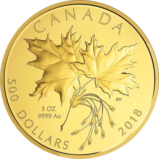 Die Vorderseite dieser Sonderedition zeigt zwei atemberaubend lebendig wirkende Ahornblätter, welche die Aufschrift "CANADA", "500 DOLLARS" und "2018" sowie die Angabe "5OZ 9999 Au" umgeben. Die Rückseite zeigt das Portrait der Königin Elizabeth II mit der Aufschrift "ELIZABETH II" und "D(ei) G(ratia) Regina".