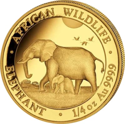 Diese feine Goldmünze ist Teil der African Wildlife Serie von dem Bayerischen Hauptmünzamt. Die Reihe ist allen in Afrika beheimateten Tierarten gewidmet. Der Hersteller ändert das Somalia Elefant Motiv jährlich.