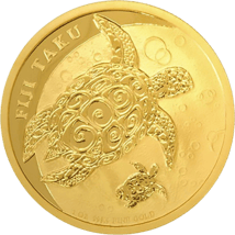Seit bereits 2010 wird die Fiji Taku in Silber als 1 Unze-Münze produziert. Im Jahr 2013 folgte auf Grund der steigenden Nachfrage auch die goldene Münze. 2013 ist jedoch das einzige Ausgabejahr der Goldmünze. Sie trägt den Nennwert von 200 Fidschi-Dollar (F$). Mit einer Feinheit von 999,9 Gold wurde das wunderschöne Motiv auf einem Durchmesser von 32,1 mm dargestellt.