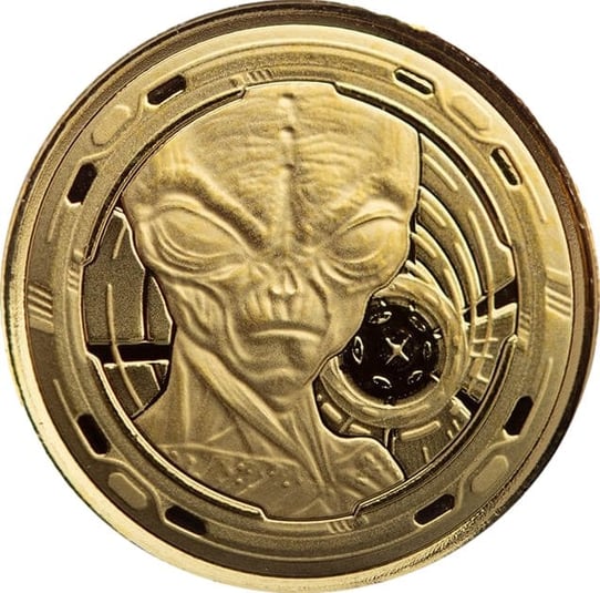 Das Gesicht, welches auf der Motivseite dieser Goldmünze zu sehen ist, würden Sie bestimmt sofort mit einem Außerirdischen in Verbindung bringen. Unsere Vorstellung davon, wie Außerirdische aussehen könnten, ist unter anderem geprägt von Filmen wie E.T. – der Außerirdische™. Die Frage, ob es tatsächlich so etwas wie Außerirdische gibt, und wie diese in Wirklichkeit aussehen, ist nach wie vor offen. Dennoch sollen sie einem Insekt ähneln. Charakteristisch ist ein sehr großer Kopf und sehr große, auffallende Augen. Im Verhältnis dazu soll der Mund von Außerirdischen sehr schmal und klein sein. Meistens werden Außerirdische sehr klein und mager dargestellt und mit einer grauen oder giftgrünen Hautfarbe. Im Hintergrund ist die sogenannte „Fliegende Untertasse“ des Außerirdischen zu sehen. Ein schwarzes, rundes Objekt, das dem Außerirdischen als Transportmittel dient. In diesem Flugobjekt ist der Außerirdische auf die Erde gelangt. Sein Blick sieht ernst und nicht sehr erfreut auf. Bestimmt hat er einige Aufgaben zu erfüllen und muss sich erst einmal an die neuen Umstände gewöhnen.