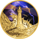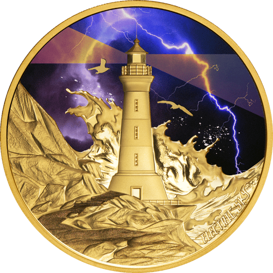 Die Vorderseite dieser Münze zeigt einen majestätischen Leuchtturm, der inmitten eines tosenden Sturms steht. Die dramatische Szene wird durch aufgewühlte Wellen, die gegen felsige Klippen schlagen, und einen von Blitzen erleuchteten Himmel in leuchtenden Violett- und Blautönen dargestellt. Zwei Vögel fliegen als Silhouetten gegen den stürmischen Himmel, was dem Motiv eine lebendige und dynamische Wirkung verleiht.