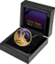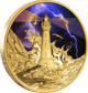 Am unteren Rand der Münze ist die Aufschrift „ELECTRIC SKY“ kunstvoll in das Design integriert. Die Kombination aus farbigem und vergoldetem Design sowie die glänzende Oberfläche verleihen dieser Münze eine besondere Brillanz und Tiefe.