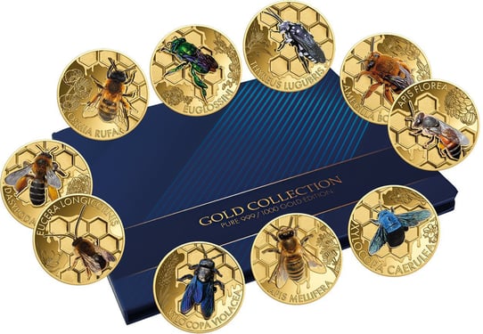 Jede der zehn Goldmünzen zeigt eine andere Bienenart in beeindruckender Detailgenauigkeit. Die kunstvolle Farbapplikation verleiht den Motiven eine außergewöhnliche Lebendigkeit. Im Hintergrund findet sich bei allen Münzen eine filigran gestaltete Wabenstruktur, die von dezenten Blütenmotiven umrahmt wird.