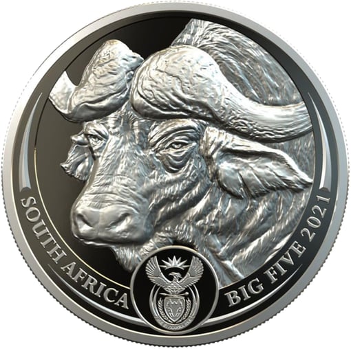Das Motiv der Münze ist dem Büffel gewidmet, einem der "Big Five" Tiere Südafrikas. Die Prägung zeigt den Kopf eines ausgewachsenen Büffels, umgeben von den Aufschriften "South Africa", "Big Five 2021" und das südafrikanische Wappen. Die Rückseite der Münze offenbart eine innovative Gestaltung: Wenn man zwei dieser Münzen nebeneinander platziert, entsteht ein vollständiges Nahaufnahmeporträt eines Büffels. Bei mehreren nebeneinander liegenden Münzen entsteht sogar das Bild einer ganzen Büffelherde.