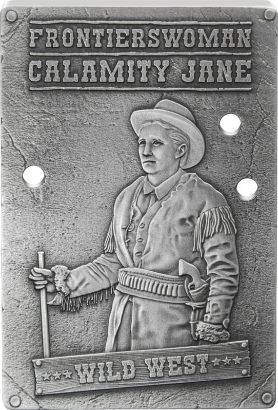 Die Vorderseite dieser rechteckigen Silberplakette präsentiert stolz Calamity Jane, eine legendäre Frontierswoman des Wilden Westens. Ihr Bild, umrahmt von den Worten "Frontierswoman Calamity Jane" und "Wild West", ist nicht nur eine Darstellung, sondern auch ein Symbol für Mut und Unabhängigkeit. Die feinen Details ihrer Erscheinung – vom breitkrempigen Hut bis zum Fransenmantel – erwecken die Ikone des 19. Jahrhunderts zum Leben. In ihrer Hand hält sie ein Gewehr, ein Zeichen ihrer bekannten Entschlossenheit und Fähigkeit, sich in einer von Männern dominierten Welt zu behaupten.