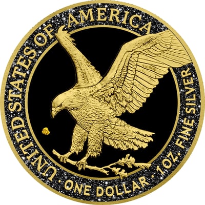 Mit einem Durchmesser von 40,60 mm und einem Feingewicht von 31,10 Gramm entspricht diese Münze den klassischen Maßen der American Eagle Serie. Die Feinheit von 999/1.000 garantiert höchste Silberqualität. Doch erst die exklusive Veredelung mit schwarzem Diamantstaub und dem aufgebrachten Goldnugget macht aus dieser Anlagemünze eine begehrte Sammlermünze der Extraklasse.