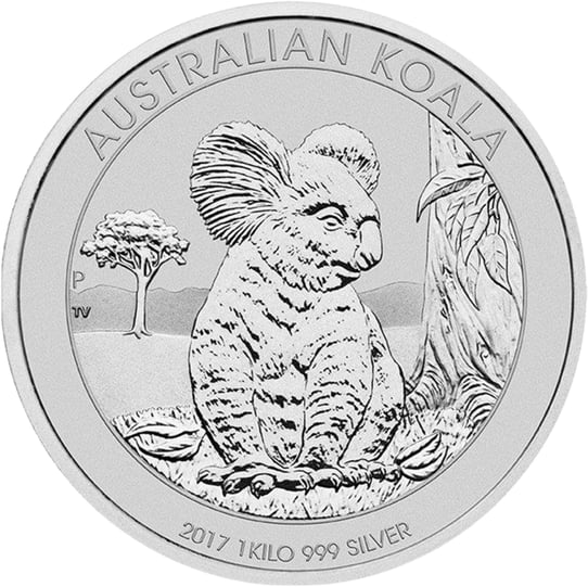 Die Motivseite der 1kg Silber Koala 2017 Münze zeigt ein detailliertes Bild eines Koalas, der auf einem Eukalyptusbaum sitzt. Die feinen Details des Koala-Fells und der Holzstruktur des Baumes zeugen von der hohen Kunstfertigkeit der Münzmeister der Perth Mint. Rechts des Koalas ist das Münzzeichen "P" eingeprägt, das für die Perth Mint steht. Darüber hinaus sind das Ausgabejahr "2017", das Feingewicht und der Feingehalt "999 SILVER" auf der Münze vermerkt.
