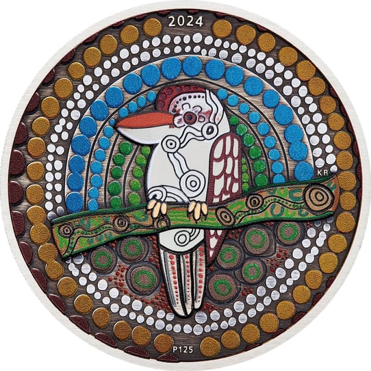 Das Motiv dieser Münze zeigt eine farbenfrohe Darstellung eines Kookaburras, inspiriert von einem Ölgemälde des Künstlers Kevin Bynder aus dem Volk der Whadjuk-Yuet-Ballardong. Die weißen Elemente des Designs symbolisieren den weißen Ocker, mit dem sich die Urvölker bemalten, wenn sie den Kookaburra-Traumtanz aufführten. Der Hintergrund besteht aus farbigen Punkten in verschiedenen Blautönen, die den Morgen-, Tages- und Abendhimmel darstellen. Grün steht für die Blätter während der Djeran-Saison (April/Mai) und Braun für die Kambarang-, Birak- und Bunuru-Jahreszeiten (Oktober/März). Dieses detailreiche und symbolträchtige Design macht die Münze zu einem wahren Meisterwerk.