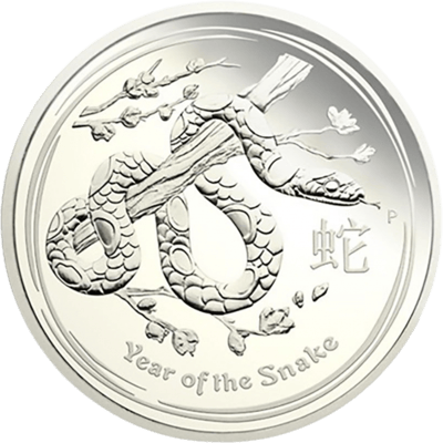 Das Avers der Münze zeigt eine eindrucksvolle Schlange, die sich um einen Ast schlängelt, umgeben von Zweigen. Chinesische Schriftzeichen und ein "P" für Perth Mint Australia sind ebenfalls abgebildet. Der untere Rand der Münze trägt die Inschrift "Year of the Snake".