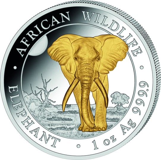 Die Vorderseite der Münze zeigt einen majestätischen afrikanischen Elefanten, der durch die karge Savanne schreitet. Das kunstvoll gestaltete Motiv wird durch die Teilvergoldung besonders hervorgehoben und verleiht der Münze eine einzigartige Ästhetik. Entlang des Münzrandes finden sich die Aufschriften „AFRICAN WILDLIFE“ und „ELEPHANT“ sowie das Gewicht „1 oz“ und die Feinheit „Ag 999.9“.
