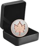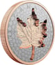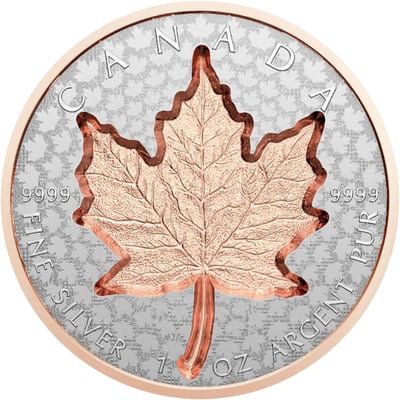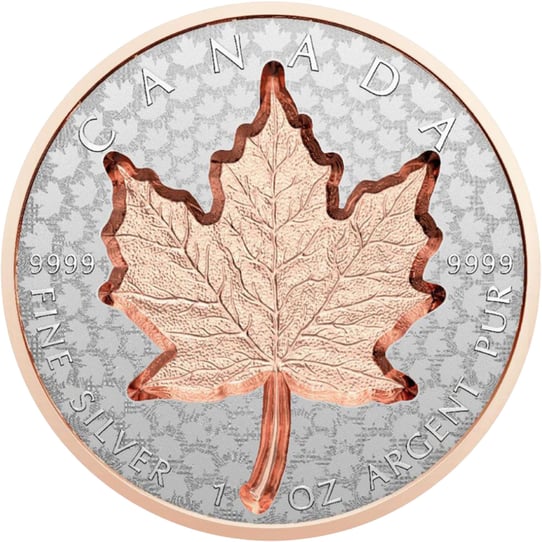 Zusätzlich ist die Münze mit selektivem Rosen-Gold plattiert und zeigt auf beiden Seiten ein Ahornblatt-Feldmuster. Dieses Zusammenspiel von Silber und Gold, von Matt und Glanz, verleiht der Münze eine besondere Ästhetik und macht sie zu einem echten Blickfang.