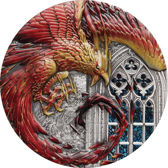 Der Phönix gilt als ein Symbol für den Kreislauf des Lebens und für Wiederauferstehung. Wenn ein Phönix ein hohes Alter erreicht hat und seine Zeit gekommen ist, dann geht es in Flammen auf. Aus dem Haufen Asche, das zurückbleibt, wird er dann wiedergeboren. Deshalb heißt diese Münze auch „Rising Phoenix“.