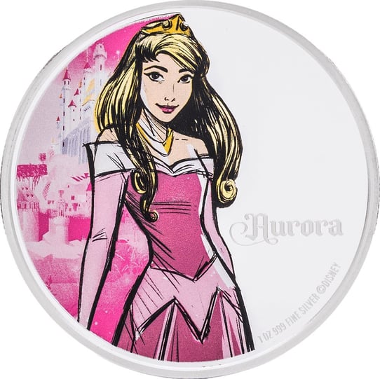Magisches Disney-Design: Die farbenprächtige Darstellung der Prinzessin Aurora vor einem märchenhaften Schloss macht diese 1-Unzen-Silbermünze zu einem bezaubernden Sammlerstück