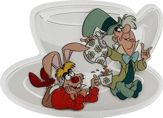 In Polierter Platte gefertigt, besticht diese 2-Unzen-Münze durch ihre außergewöhnliche Formgebung und detailreiche Gestaltung. Das farbige Motiv zeigt den verrückten Hutmacher und den Märzhasen in ihrer legendären Teeparty-Szene. Durch spezielle Frosting- und Spiegelglanz-Techniken entsteht ein faszinierender 3D-Effekt, der die Charaktere lebendig erscheinen lässt.