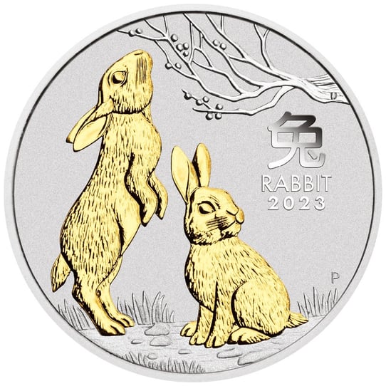 Die Motivseite zeigt einen lebhaften Hasen, der zwischen hohen Gräsern herumspringt. Außerdem enthält das Motiv das chinesische Schriftzeichen für „Hase„, die Aufschrift „RABBIT 2023“ und das Prägezeichen „P“ der Perth Mint.