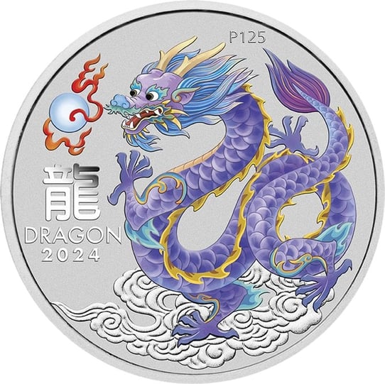 Diese wunderschöne Münze zeigt auf ihrer Vorderseite einen majestätischen Drachen in einem dynamischen und farbenfrohen Design. Der Drache windet sich um eine Perlensphäre, die in Rot und Weiß gehalten ist und Flammen ausstrahlt. Der Körper des Drachen ist in beeindruckenden Schattierungen von Blau und Lila dargestellt, mit gelben Akzenten entlang der Wirbelsäule und der Schwanzspitze. Die ausgeprägten Klauen und das markante Gesicht des Drachen, aus dem blaue Flammen hervorkommen, sind besonders detailliert gestaltet. Über dem Drachen befindet sich die Prägung "P125".