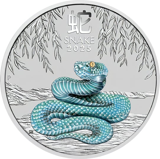Die Vorderseite der Silbermünzen zeigt eine meisterhaft kolorierte Schlange in türkisen Farbtönen, umrahmt von filigranen Weidenzweigen. Das chinesische Schriftzeichen für "Schlange" und die Jahreszahl 2025 vervollständigen das eindrucksvolle Design. Die Rückseite ziert das erste offizielle Münzporträt von König Charles III.