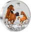Die Vorderseite dieser außergewöhnlichen Münze zeigt ein atemberaubendes coloriertes Motiv: Zwei majestätische Pferde in voller Bewegung, deren warme Brauntöne einen faszinierenden Kontrast zum glänzenden Silber bilden. Das größere Pferd mit seiner wallenden dunklen Mähne scheint förmlich aus der Münze herauszuspringen, während das kleinere Fohlen daneben spielerisch aufbäumt. Das chinesische Schriftzeichen für "Pferd" sowie die englische Bezeichnung "HORSE 2026" vervollständigen dieses kunstvolle Arrangement. Das "P" als Prägezeichen der Perth Mint bezeugt die edle Herkunft.