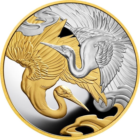Das Motiv zeigt zwei anmutige Kraniche in einer harmonischen Komposition. Während ein Kranich in strahlendem Silber erscheint, erstrahlt der andere in edlem Gold. Der glatte Münzrand ist ebenfalls vergoldet, was der Münze einen besonders edlen Charakter verleiht. Die Polierte Platte Prägequalität bringt die feinen Details und Kontraste zwischen den Gold- und Silberelementen perfekt zur Geltung.