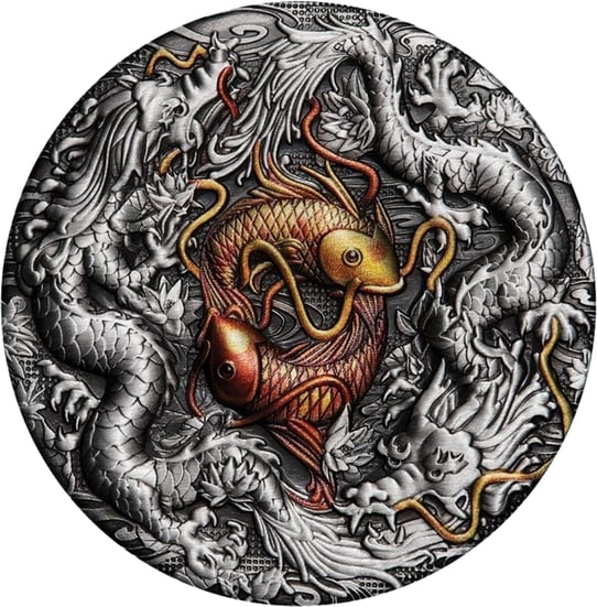 Der Legende nach begibt sich der Koi auf die Reise ein Drache zu werden. Dafür ist der Huang Ho Fluss, auch bekannt als gelber Fluss, mit allen seinen Erfahrungen zu überwinden. Eine der Gefahren ist, den Fluss stromaufwärts zu schwimmen. Diese Herausforderung hat ein kleiner Koi der Sage nach überwunden. Daraufhin entschieden die Götter den Koi die Ehre zuteil kommen zu lassen sich in einen Drachen zu verwandeln. Das Antik Finish der Münzseiten verleiht der Silbermünze ein hohes Maß an Authentizität.