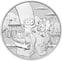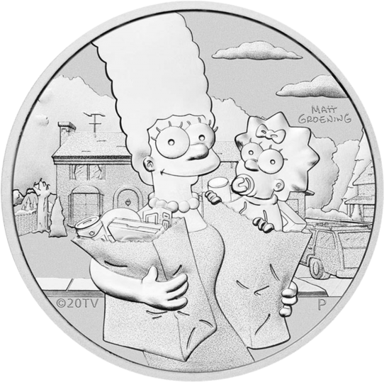 Die Simpsons™ ist eine US-amerikanische Zeichentrickserie, die von Matt Groening erschaffen wurde. Die erste Folge wurde bereits im Jahr 1989 ausgestrahlt. Mittlerweile gibt es 34 Staffeln und über 700 Episoden. Im Jahr 2023 wurde bekannt gegeben, dass es auch eine 35. und 36. Staffel geben wird. Bei den Simpsons™ dreht sich alles um die gelben Bewohner der fiktiven Stadt Springfield. Im Zentrum steht die Familie Simpsons, die aus Homer, Marge und ihren Kindern Lisa, Bart und Maggie besteht. Auf der Motivseite dieser Silbermünze sind Marge und die kleine Maggie abgebildet. Marge kommt offensichtlich gerade von einem Einkauf beim Supermarkt zurück. Sie steht vor ihrem großen Haus und hält zwei Papiertüten voller Lebensmittel in den Händen. Die kleine Maggie schaut aus einer der Papiertüten heraus. Sie hat eine Schleife in ihrem Haar und einen Schnuller im Mund. Mit all den Einkäufen hat Marge einfach keine Hand mehr frei, um ihre Tochter zu tragen. Marge trägt ihr charakteristisches Kleid und ihre Perlenkette. Die Figuren aus der Zeichentrickserie sind bekannt dafür, immer gleich auszusehen und gleich alt zu sein. Neben ihrem Outfit sind auch Marges Haare ihr Markenzeichen. Ihre blauen Haare fallen nicht runter, sondern stehen ab wie ein Turm.