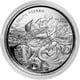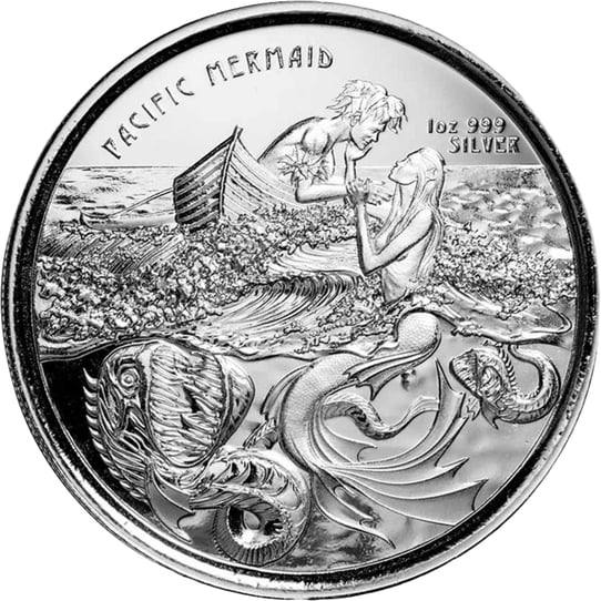 Es wird ein Mann in einem Ruderboot, das im Meer treibt abgebildet. Gleichzeitig erscheint eine einsame Meerjungfrau, die nach dem Seemann greift. Gefährliche Seeschlangen lauern unter dem Boot und runden das Motiv ab. Der Schriftzug “PACIFIC MERMAID” sowie die Bezifferung “1 oz 999 SILVER” sind zu erkennen.