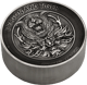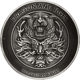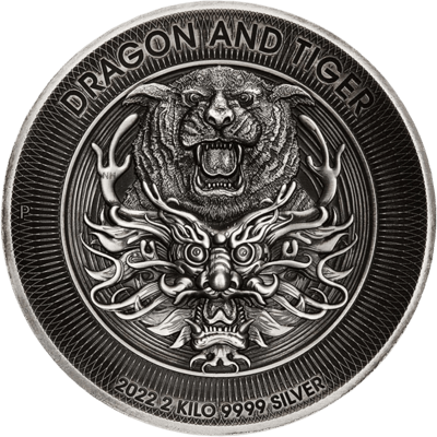 Diese Silbermünze mit Antik Finish weist auf der Vorderseite eine erstklassige Verjüngung nach innen, in Schalenform auf. Wie tief die Schalenform ist, lässt sich anhand einer sagenhaften Höhe von 36,30 mm erkennen. Durch die High-Relief-Technik wirkt der Kopf des Tigers über dem weitläufigen Kopf des Drachens besonders real. Die beiden Wesen sind durch einen Riffelrand umkreist, in dem die Schriftzüge „DRAGON AND Tiger“ und „2022“, „2 KILO 9999 SILVER“ zu finden sind. Auch der Rand der auffällig breiten Münze ist geriffelt.