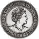 Da es sich um eine gesetzliche Währung mit einem Nennwert von 60 AUD-Dollar handelt, ist das offizielle Porträt von Queen Elizabeth II auf der Rückseite. Auch hier wird die Wirkung des Antik Finish besonders gut ersichtlich. Als Schriftzüge wurde auf „ELIZABETH II“, „AUSTRALIA“ und „60 DOLLARS“ Wert gelegt.