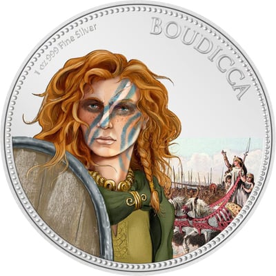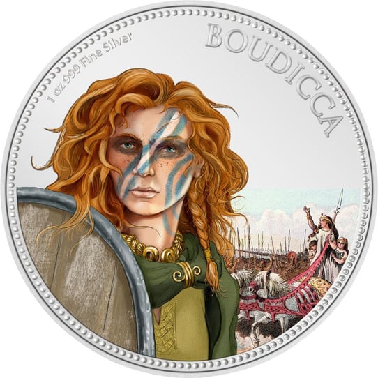 Das farbige Motiv dieser Silbermünze zeigt die furchtlose, keltische Königin Boudicca. Sie hat rötliches, welliges Haar und ist mit einem Schutzschild bewaffnet. Ihr Gesicht hat sie mit weißen und blauen Streifen bemalt. Sie trägt ein grünes Gewand.