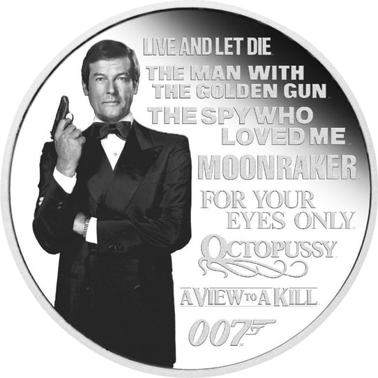 Die Vorderseite dieser Münze ist mit dem britischen Schauspieler Roger Moore geprägt. Er war der dritte Schauspieler, der in die Rolle des Spions James Bond™ geschlüpft ist. Er spielte James Bond™ von 1973 bis 1985 und ist in insgesamt sieben James Bond™-Filmen zu sehen. Die Titel der James Bond™-Filme, in denen Roger Moore mitgespielt hat, sind ebenfalls auf dem Münzmotiv eingeprägt.