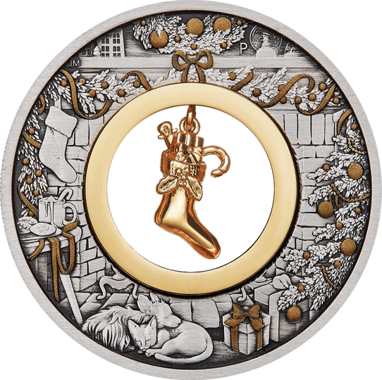 Die Münze besticht durch ihr außergewöhnliches Design. Auf der Vorderseite sehen wir ein liebevoll gestaltetes Weihnachtsmotiv im Stil eines Kamins, mit einer besonderen Öffnung in der Mitte der Münze. Hier hängt ein vergoldeter Strumpf, der auf eine alte Tradition hinweist: Kinder hängen ihre Strümpfe am Kamin auf, in der Hoffnung, dass diese am nächsten Morgen mit Geschenken gefüllt sind. Auf der Rückseite der Münze ist ein Nistelzweig zu sehen, der die Münze kunstvoll umschwingt.