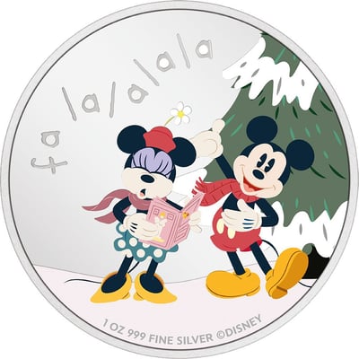 Die Münze zeigt das berühmte Mäuse-Duo Minnie Mouse™ und Mickey Mouse™ vor einem verschneiten Weihnachtsbaum. Minnie™ ist voller Eifer dabei, Weihnachtslieder zu singen, während Mickey™ lächelnd daneben steht und aufmerksam zuhört. Das farbliche Design wird von der Aufschrift "falalalala" umrahmt, ebenso wie das Gewicht und die Feinheit der Münze. Die Rückseite präsentiert das Bildnis von König Charles III sowie den Nennwert und das Ausgabejahr.