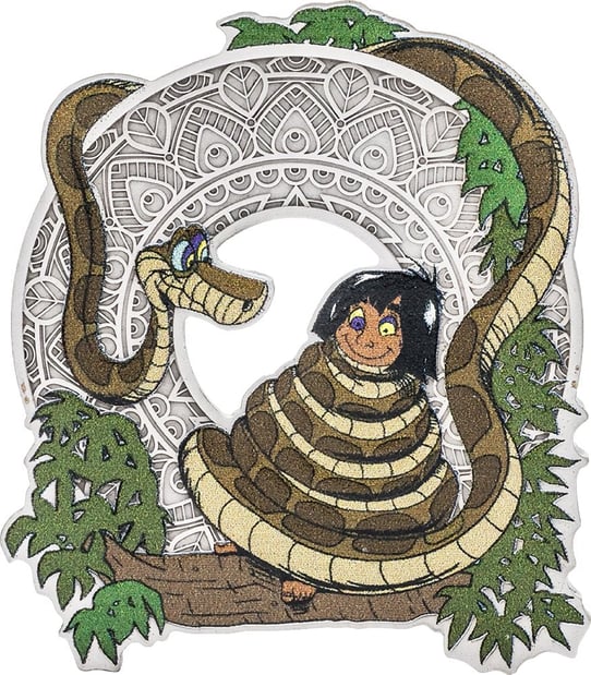 Das Motiv dieser Silbermünze zeigt die berühmte Szene aus dem Disney-Klassiker "Das Dschungelbuch", in der die hypnotisierende Schlange Kaa den Jungen Mogli umschlingt. Diese Szene ist meisterhaft in Farbe dargestellt und fängt die Essenz des Films perfekt ein. Die Münze ist in einer einzigartigen Form gestaltet, die die Szene noch lebendiger macht.