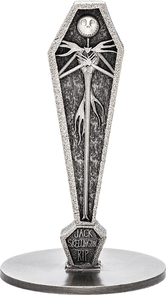 Diese exklusive Silber-Miniatur ist Jack Skellington, dem ikonischen Charakter aus Tim Burtons "The Nightmare Before Christmas", gewidmet. Entworfen vom renommierten 3D-Bildhauer Alejandro Pereira Ezcurra, zeigt die Figur den grinsenden "Kürbiskönig" Jack Skellington in einem Sarg stehend, mit vor dem Brustkorb verschränkten Armen. Jede Figur ist mit einer individuellen Produktionsnummer und dem Copyright auf einer Metallplatte im Sockel versehen, was ihre Einzigartigkeit unterstreicht.