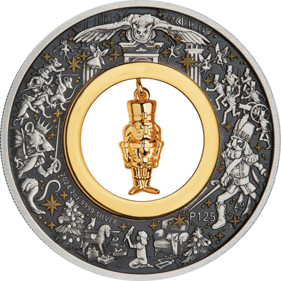 Auf der Vorderseite der Münze finden Sie eine beeindruckende Darstellung der zentralen Charaktere des berühmten Weihnachtsmärchens: den Nussknacker, seinen Gegenspieler, den Mäusekönig, und ein kleines Mädchen, das von Weihnachtsgeschenken umgeben ist. Diese Szene wird durch liebevoll gestaltete Details wie Feen, Weihnachtsbäume, eine Eule und goldene Sterne ergänzt. Ein besonderes Highlight ist das Prägezeichen „P125“, welches das 125-jährige Jubiläum der Perth Mint symbolisiert.