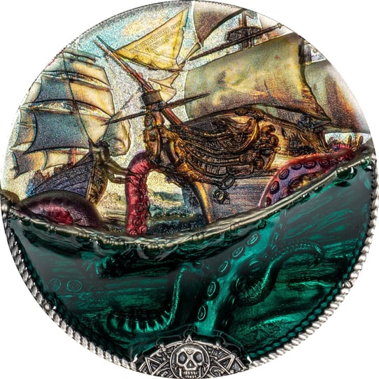 • Spektakuläre High-Relief-Prägung zeigt dramatischen Kampf zwischen Kraken und Segelschiff in brillanten Farben