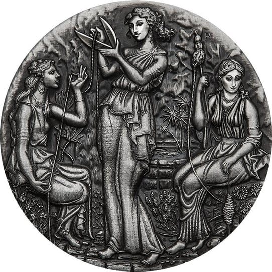 Das imposante Motiv zeigt die drei Moiren - Klotho, Lachesis und Atropos - die in der griechischen Mythologie als Schicksalsgöttinnen verehrt wurden. Die High Relief Prägung verleiht der Darstellung eine beeindruckende Plastizität und Tiefenwirkung. Selbst feinste Details der Gewänder und Gesichtszüge der Göttinnen kommen durch das edle Antik Finish besonders zur Geltung.