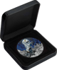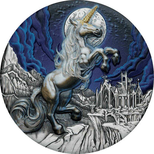 Die streng limitierte 5-Unzen-Münze besticht durch ihr randloses Design und die aufwendige Antik-Finish-Veredelung. Das majestätische weiße Einhorn, Symbol für Reinheit und Kraft, erhebt sich vor einer detailreich gravierten Berglandschaft. Der kobaltblaue Nachthimmel und die mittelalterlich anmutende Bergstadt mit ihrer imposanten Kirche erschaffen eine geradezu magische Atmosphäre.