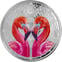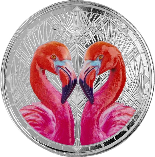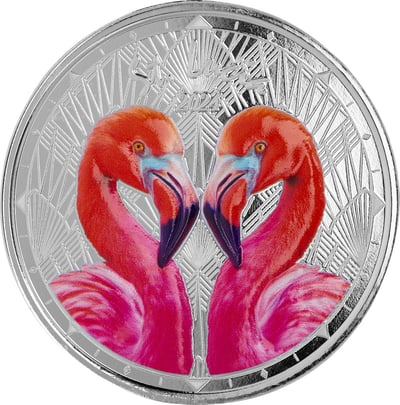 Das Hauptmotiv zeigt zwei majestätische Flamingos in einer beeindruckenden Farbgebung. Die leuchtend roten und rosa Farbtöne der Vögel kontrastieren wunderschön mit dem silbernen Hintergrund der Münze. Die detaillierte Kolorierung bringt die natürliche Schönheit dieser eleganten Vögel perfekt zur Geltung.