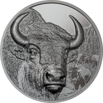 Die spektakuläre High Relief Prägung erweckt den mongolischen Bison zum Leben. Jedes Detail – vom zotteligen Fell über die markanten Hörner bis hin zum durchdringenden Blick – wurde mit außergewöhnlicher Präzision herausgearbeitet. Diese dreidimensionale Darstellung verleiht der Münze eine Tiefe und Lebendigkeit, die bei herkömmlichen Prägungen unerreichbar bleibt. Im Hintergrund sind weitere Bisons zu erkennen, die die weiten Steppen der Mongolei bevölkern.
